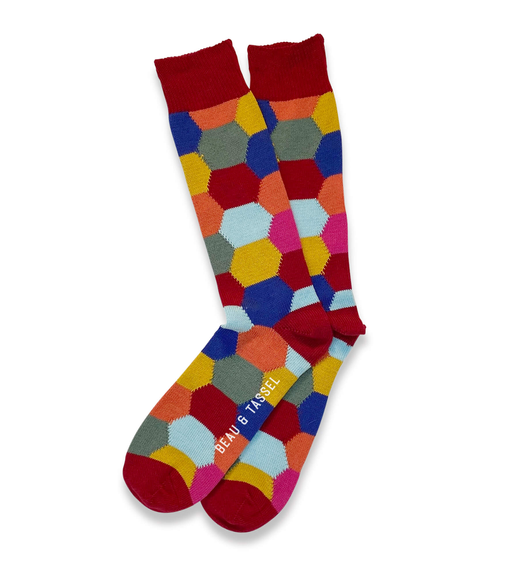 82% English combed cotton, 18% nylon with just a touch of elastane in the top to keep them up all day long. Mid-calf length. Brilliant fit and durability whilst preserving colour wash after wash.
